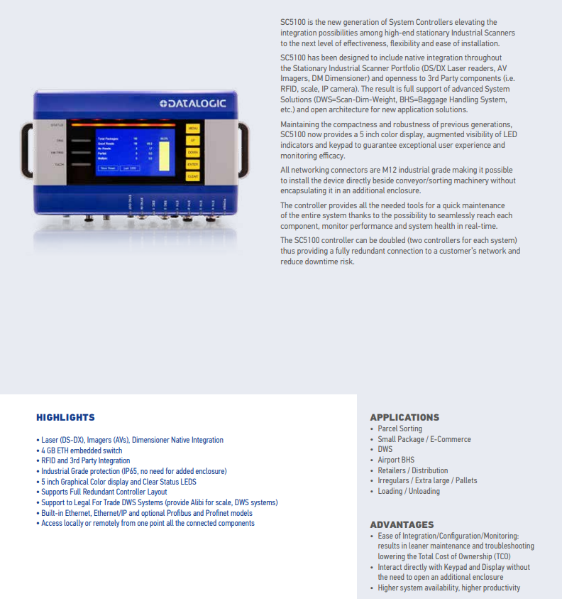 • 得利捷SC5100固定式工業系統控制器的設計包含了整個固定式工業掃描器組合(DS/DX系列激光閱讀器、AV系列掃描器、DM系列體積測量儀)的本公司產品集成,且支持第三方組件(如RFID、秤、網絡相機)的集成開放接口。其結果是完全支持的系統解決方案(DWS=Scan-Dim-Weight,BHS=Baggage Handling等),并為新的應用解決方案提供了可能性。 一個完全可配置的嵌入式4口千兆以太網交換機,可選的現場總線模塊和擴展的內存強有力的說明了它可以靈活地支持復雜的解決方案,并為本地和遠程監控提供先進的工具(時刻應對物聯網和工業4.0環境)。